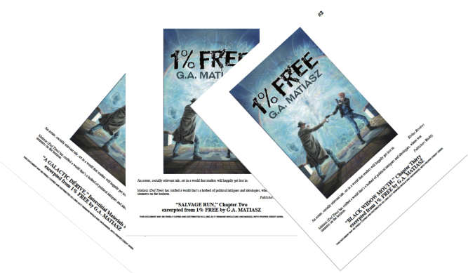 I have three free PDF excerpts from my novel “1% Free.” The first is entitled “A Galactic Derive” and offers a glossary of terms to help the reader navigate the world of 2042.